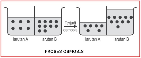 merupakan perpindahan molekul air dari konsentrasi molekul yang tinggi (hipotonis) ke konsentrasi molekul yang rendah (hipertonis) melalui membran semipermiabel.